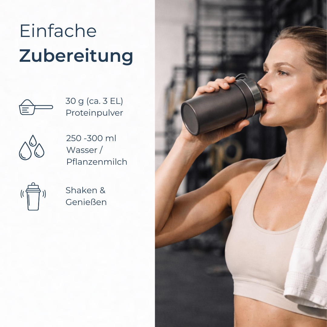 Mische 30 g (3 EL) Vegan Protein+ mit 250–300 ml Wasser oder Deiner bevorzugten Pflanzenmilch in einem Shaker. Das Pulver löst sich mühelos auf und sorgt für eine angenehm cremige, feine Textur. Je nach gewünschter Konsistenz kannst Du die Flüssigkeitsmenge individuell anpassen.