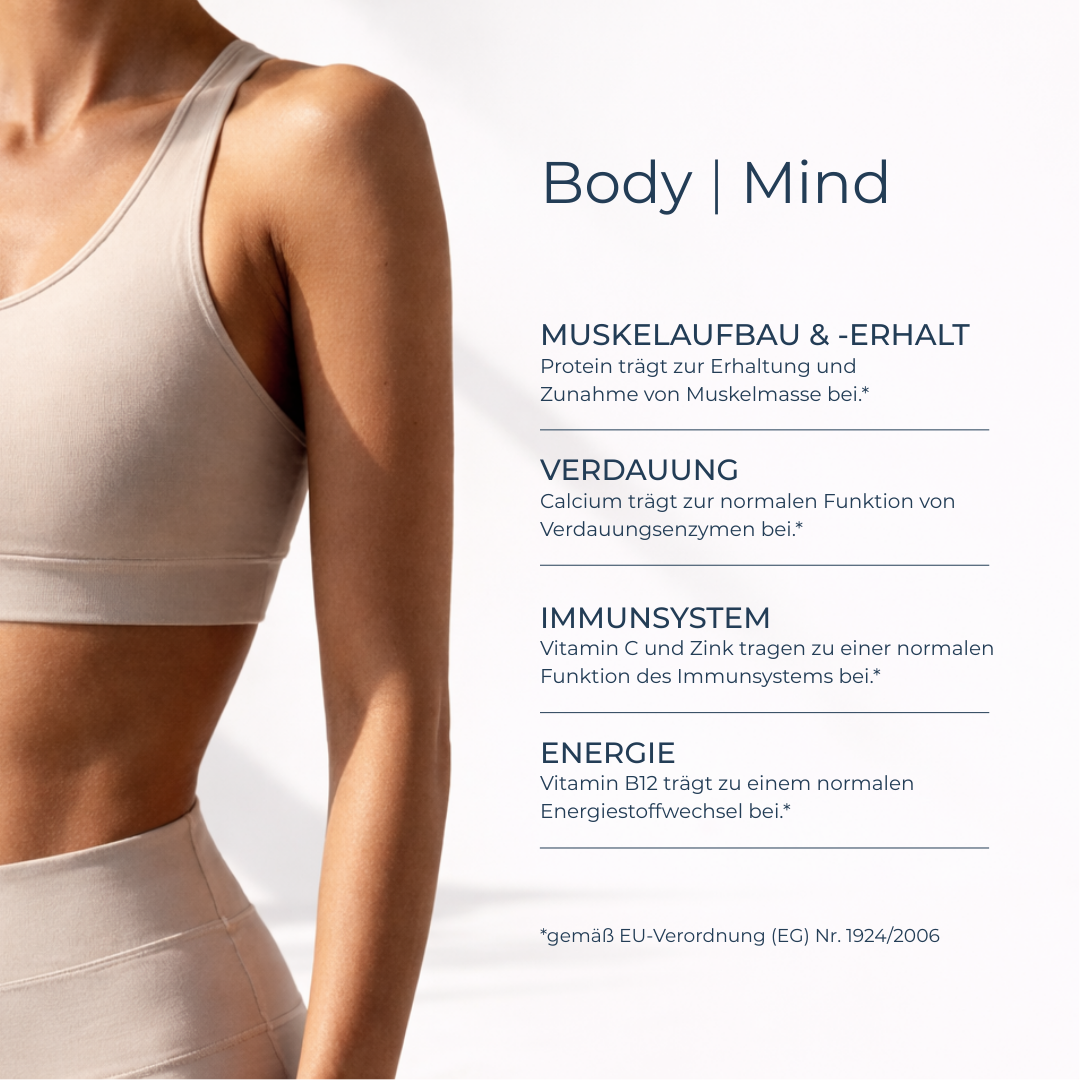 ¹ Proteine tragen zum Aufbau und Erhalt von Muskelmasse bei.² Calcium trägt zur normalen Funktion von Verdauungsenzymen bei.³ Vitamin C, B12 und Zink tragen zu einer normalen Funktion des Immunsystems bei.