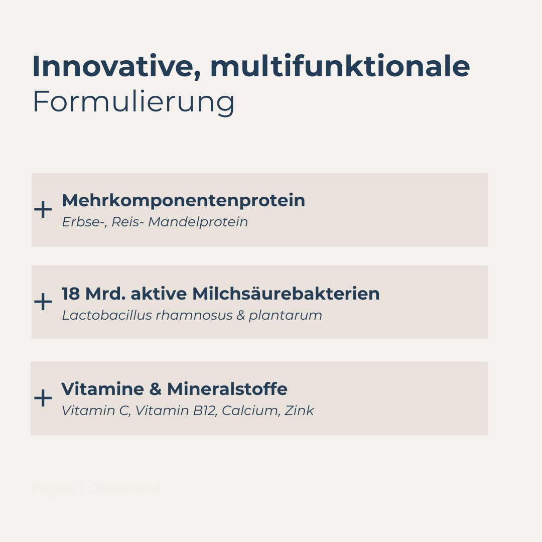 Es kombiniert hochwertige pflanzliche Proteine mit funktionellen Nährstoffen, die deinen Körper ganzheitlich unterstützen – für spürbare Energie, ein gutes Bauchgefühl und Balance im Alltag.